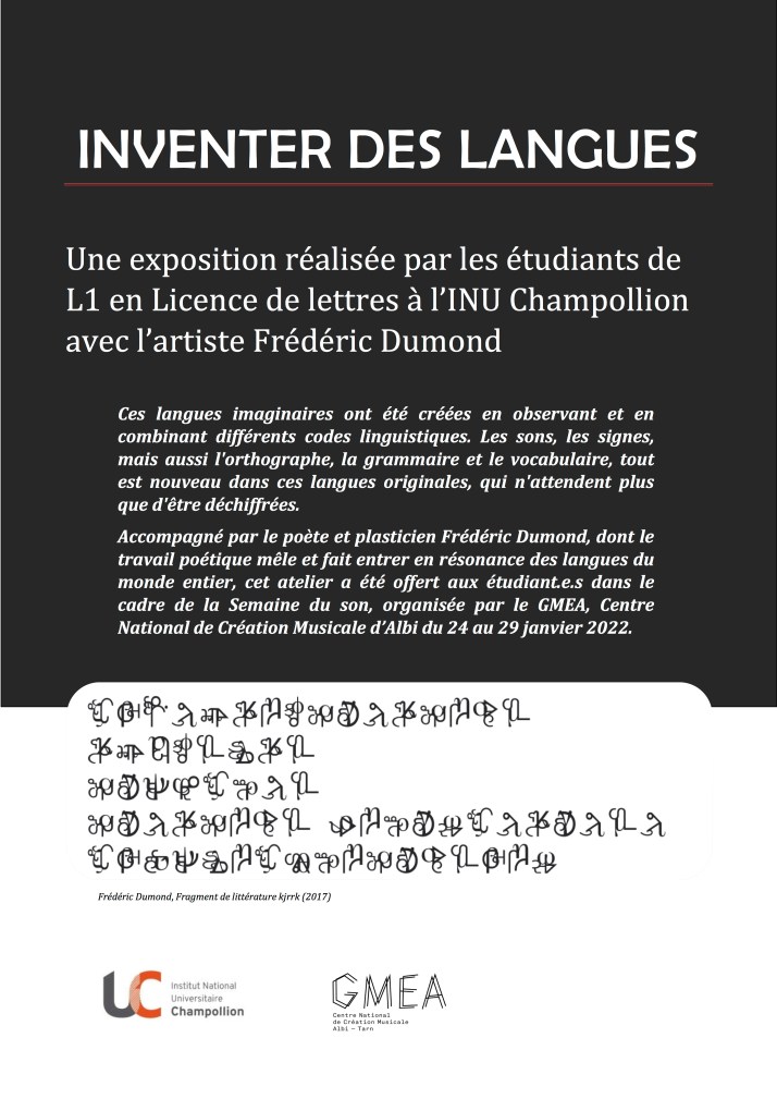via ce lien, une présentation des langues par leurs auteurs. immense merci à Séverine Abiker pour son invitation à explorer la possibilité de langues au sein de l’UNI Champollion d’Albi et à Nathalie Boutonet pour l’ensemble vidéo qui en documente précisément le processus