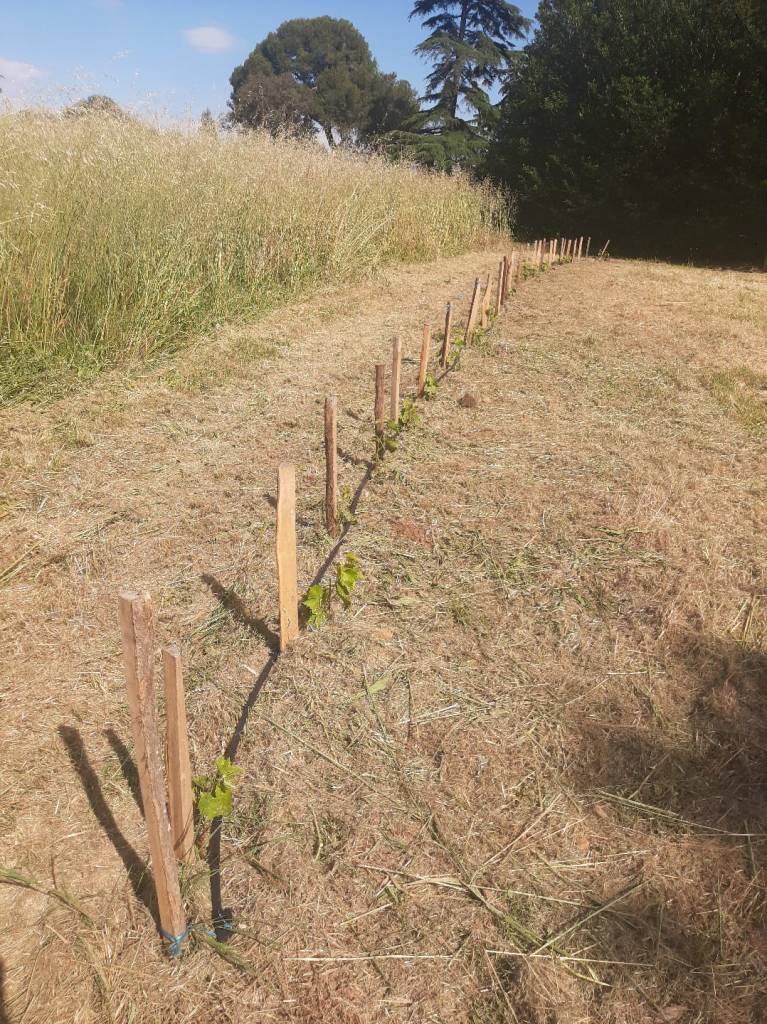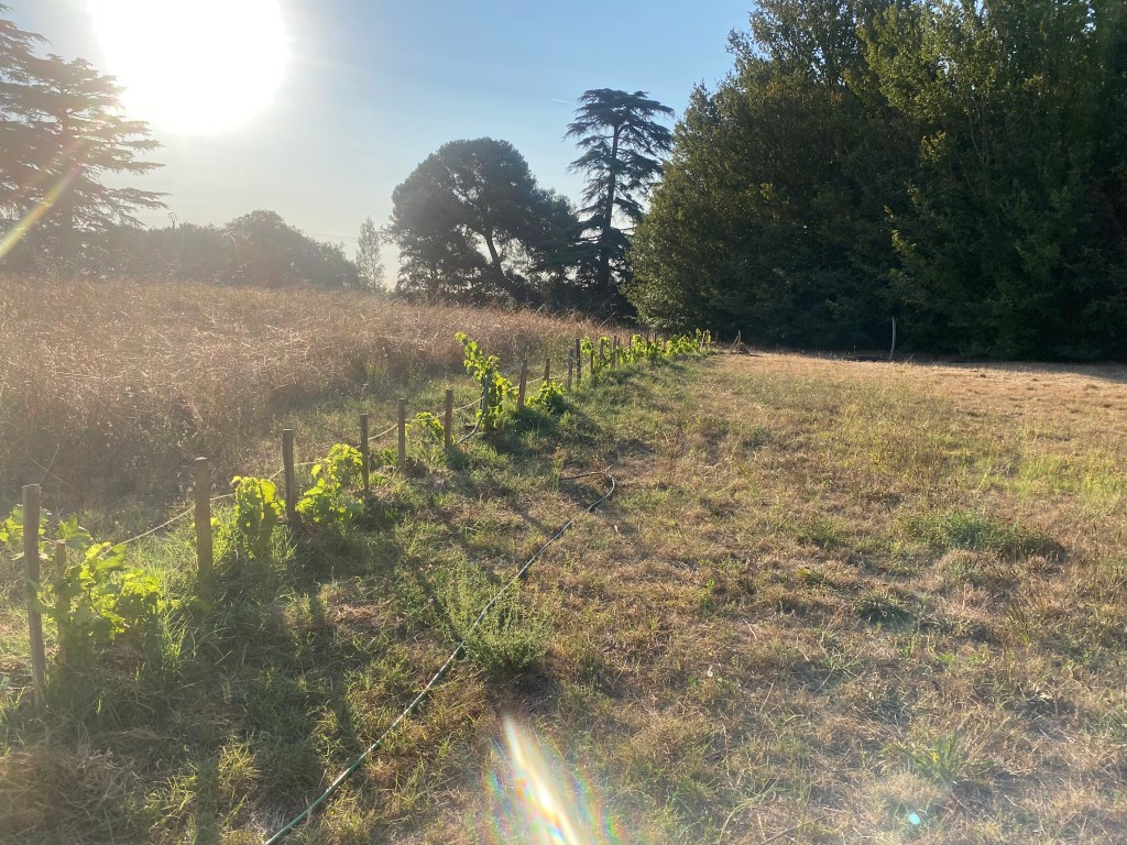 début avril 2025, plantation d’une ligne de 30 plants de vigne, muscat blanc et muscat noir type Garanth, résistants.